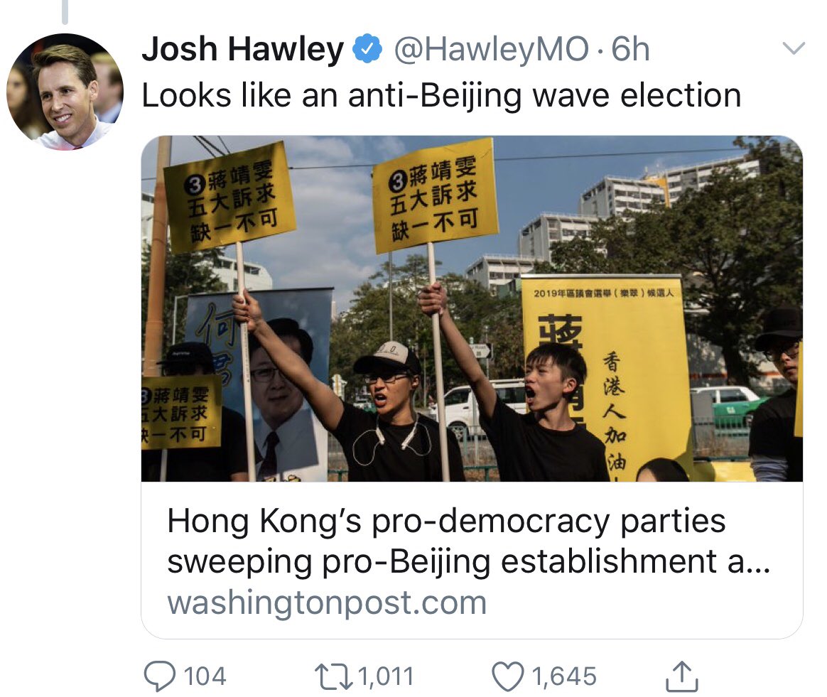 美国共和党参议员霍利24日发推评论香港区议会选举结果“看起来像是一场反北京浪潮选举。”