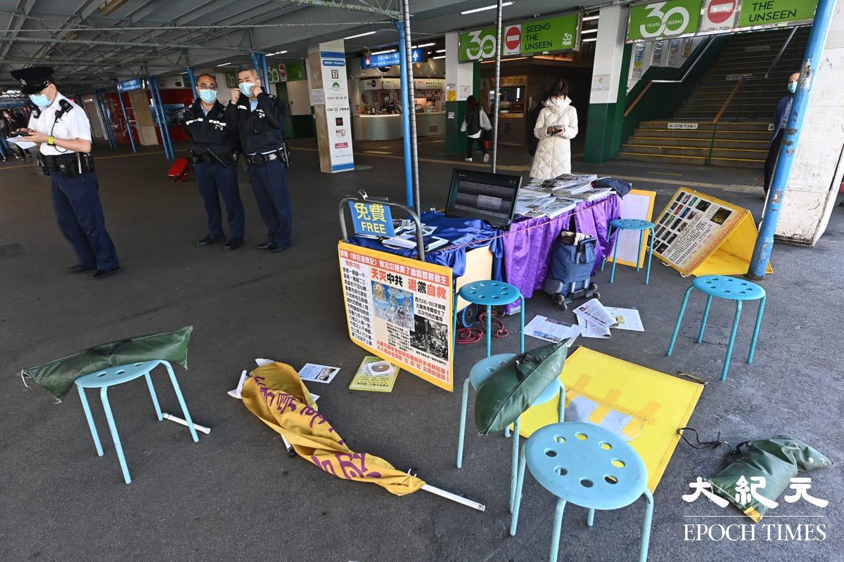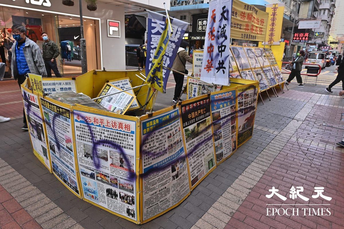 #旺角 法輪功真相點和 #尖沙咀 #真相點 相繼在今天中午時間再被歹徒惡意破壞,旺角直相點展板被噴漆,尖沙咀則被搗亂及將展板拋落海,需要水警輪出海打撈。(攝影:宋碧龍)