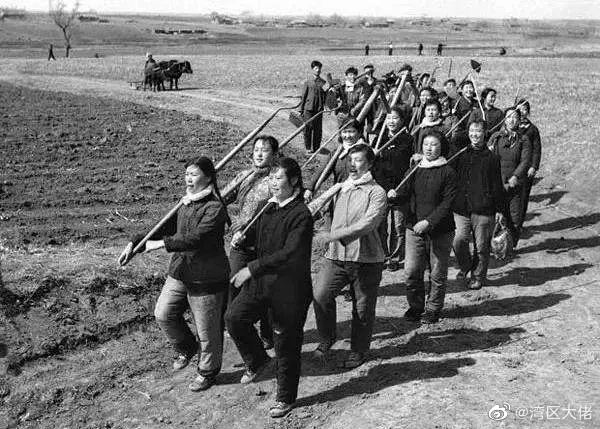 六十年代,喊着口号、踏着整齐的步伐参加农业生产劳动的男女社员