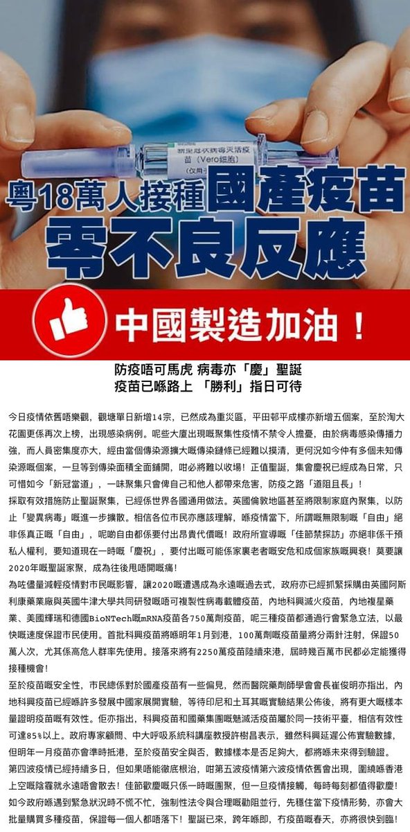 国产疫苗已经在广东接种18万, 零不良反应.香港此时应该尽快引入, 控制疫情发展, 病毒面前, 只有疫苗才能打赢这场攻坚战!!