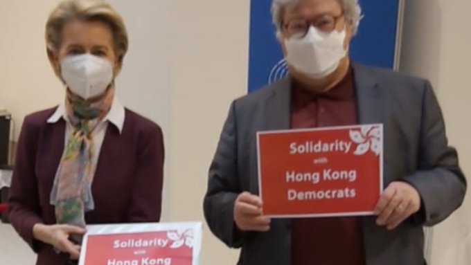 欧盟执委会主席冯德莱恩在欧洲议会举牌支持港人。