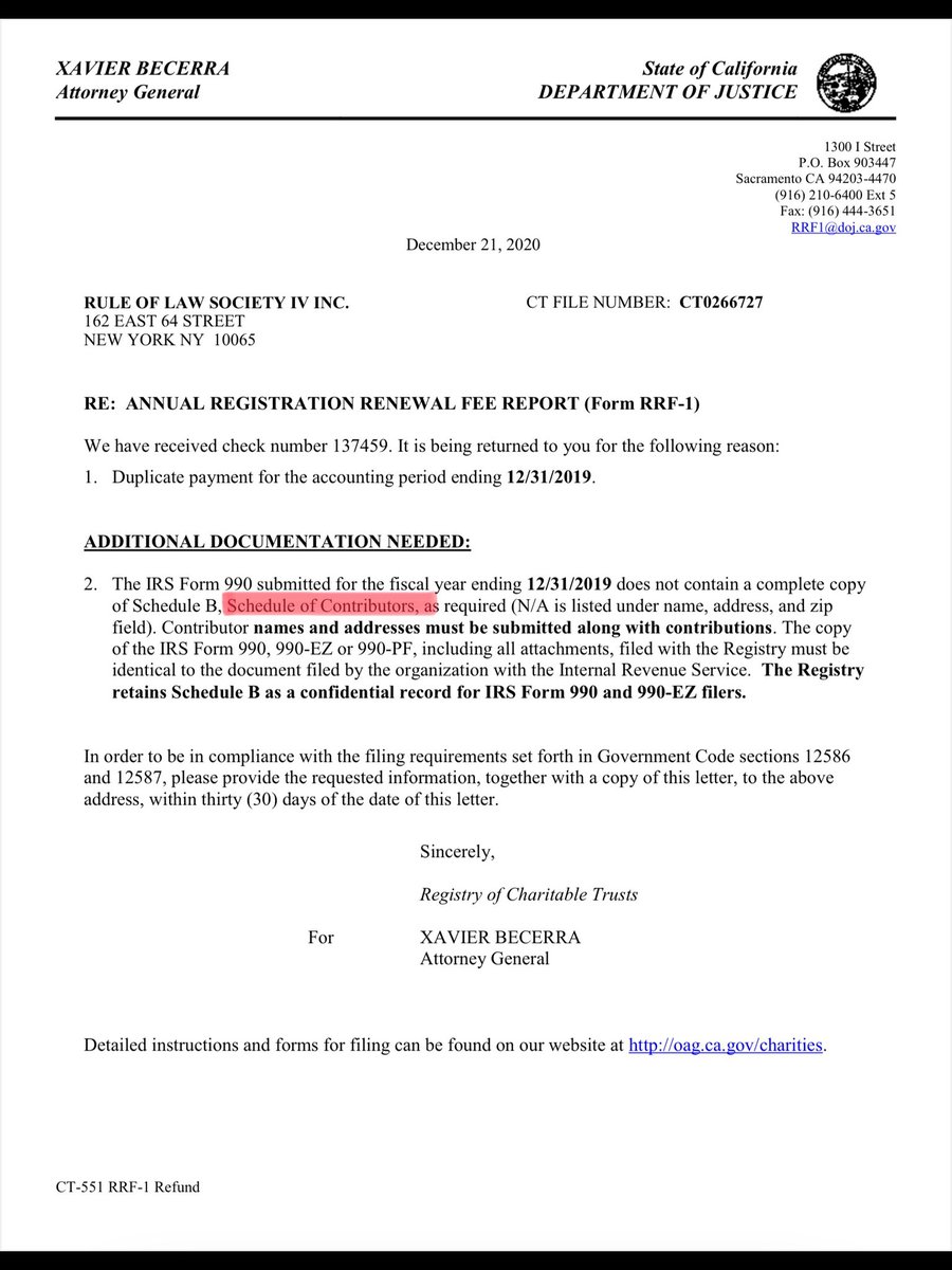 法治公会990报表 2019全年捐款共计204万。2019年未按规定呈交“捐款人信息表”。