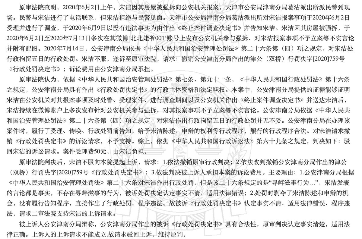 天津男子宋洁,在其房屋被强拆后在微博指控警察参与强拆,且对其强拆案拒不立案,被处拘留5日。宋洁以其微博言论属实为由提起行政诉讼,但败诉。