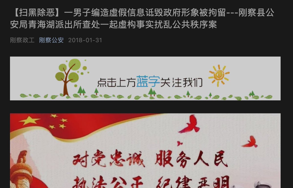 青海省刚察县男子多某,因在微信群里发表了两条语音信息“质疑政府在慰问活动中存在不按规定发放慰问品现象“,被处拘留9日并罚款200元。警方通报中直接称多某发的信息属于质疑政府,但是是没有依据的质疑。
