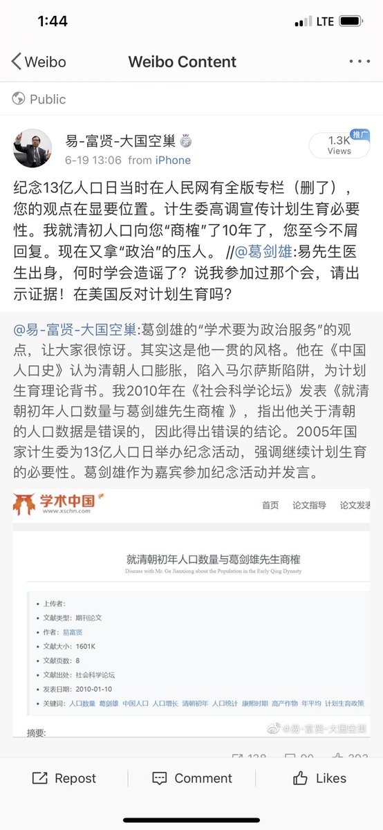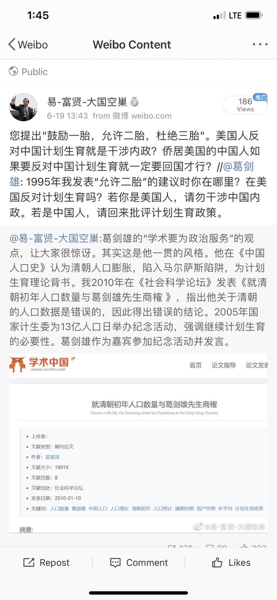 复旦大学葛剑雄指责我反对计划生育是干涉中国内政。”在美国反对计划生育吗?至于研究清初人口数量,等你补好了历史,再回应你不迟。若你是美国人,请勿干涉中国内政。若是中国人,请回来批评计划生育政策。“
