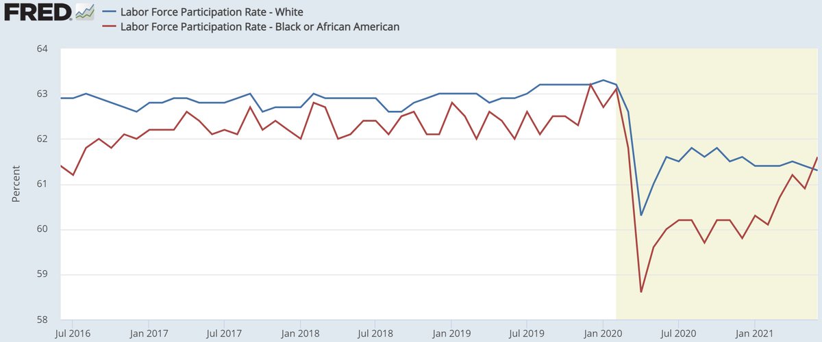 根据今天最新数据,美国黑人的劳工参与率已经略微超过白人。考虑到黑人受过监禁的比例大大高于白人,美国有犯罪记录的人很难进入就业市场,黑人的劳工参与率是相当可观的。这一数据和黑人爱吃福利的偏见十分矛盾。图中红线为黑人,蓝线为白人。