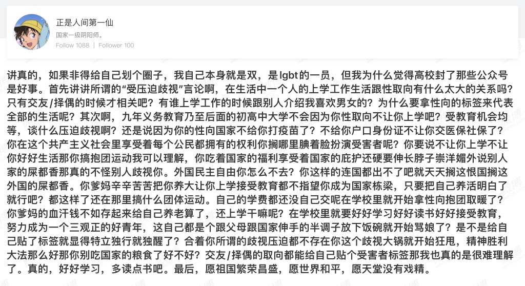 “虽然我是LGBT但真没觉得哪里被歧视压迫了,国家养着你庇护你你还崇洋媚外就别怪被歧视…”因为太神奇了,我专门上主页看了,真的不是反串。