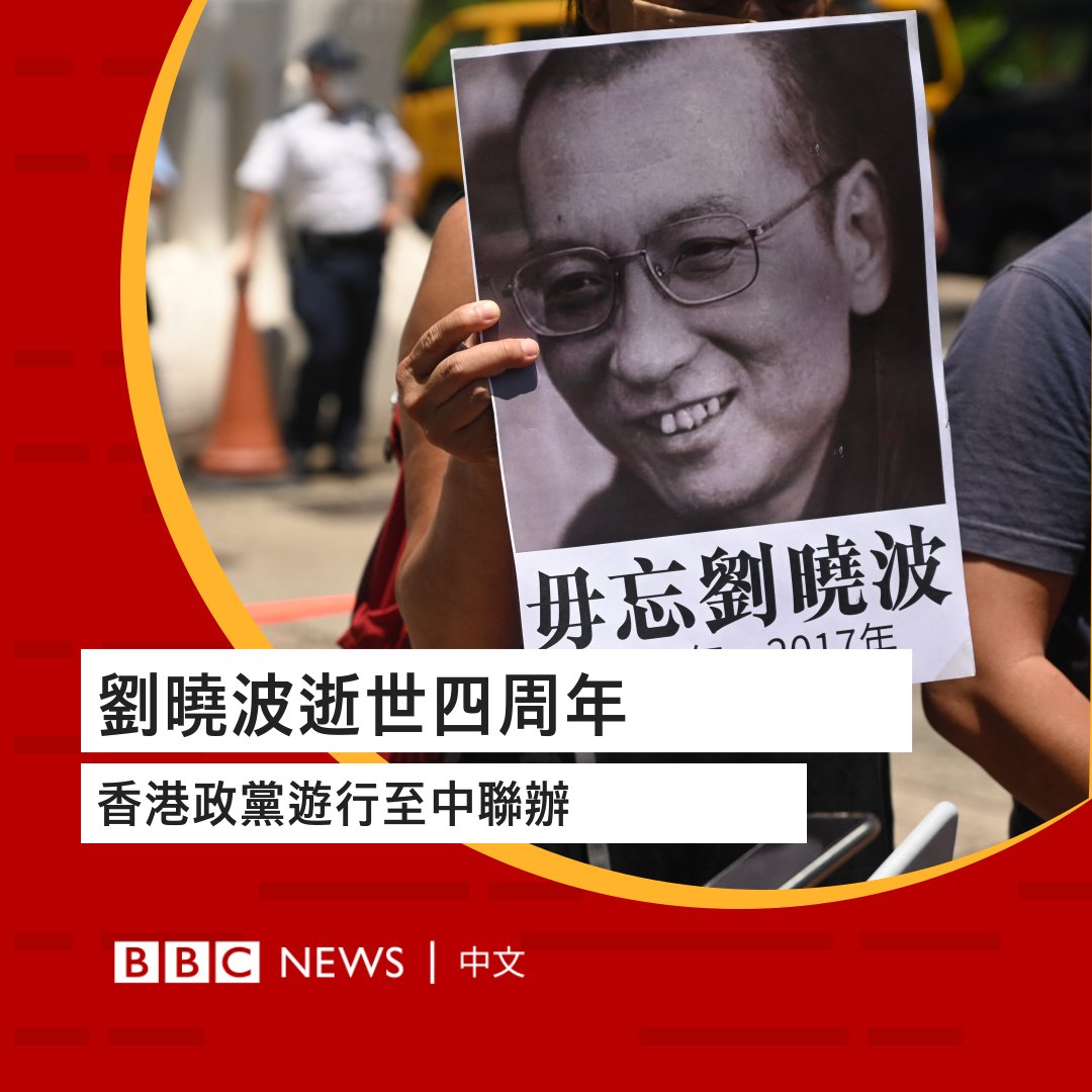 诺贝尔和平奖得奖者刘晓波逝世4周年,香港民主派政党社民连几位成员,早上游行到中联办,悼念刘晓波并声援内地维权人士。(:Getty Images)