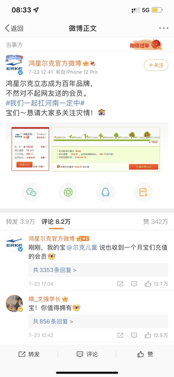 哈哈 鸿星尔克亏损还捐了5000万网友野性消费 还帮忙充了120微博会员