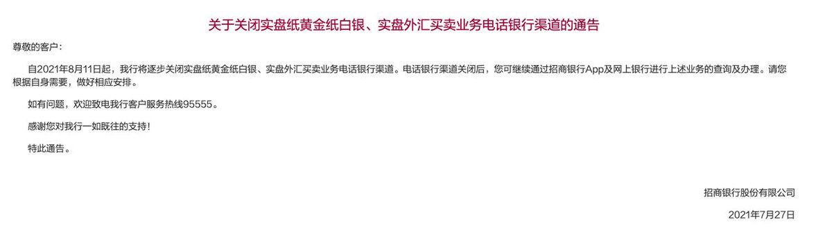 招商银行:即日起关闭个人双向外汇买卖业务(非实盘外汇买卖)新客户签约功能。 自2021年8月11日起,我行将逐步关闭实盘纸黄金纸白银、实盘外汇买卖业务电话银行渠道。招行陆续要停个人外汇和黄金业务,理由是风险较大。