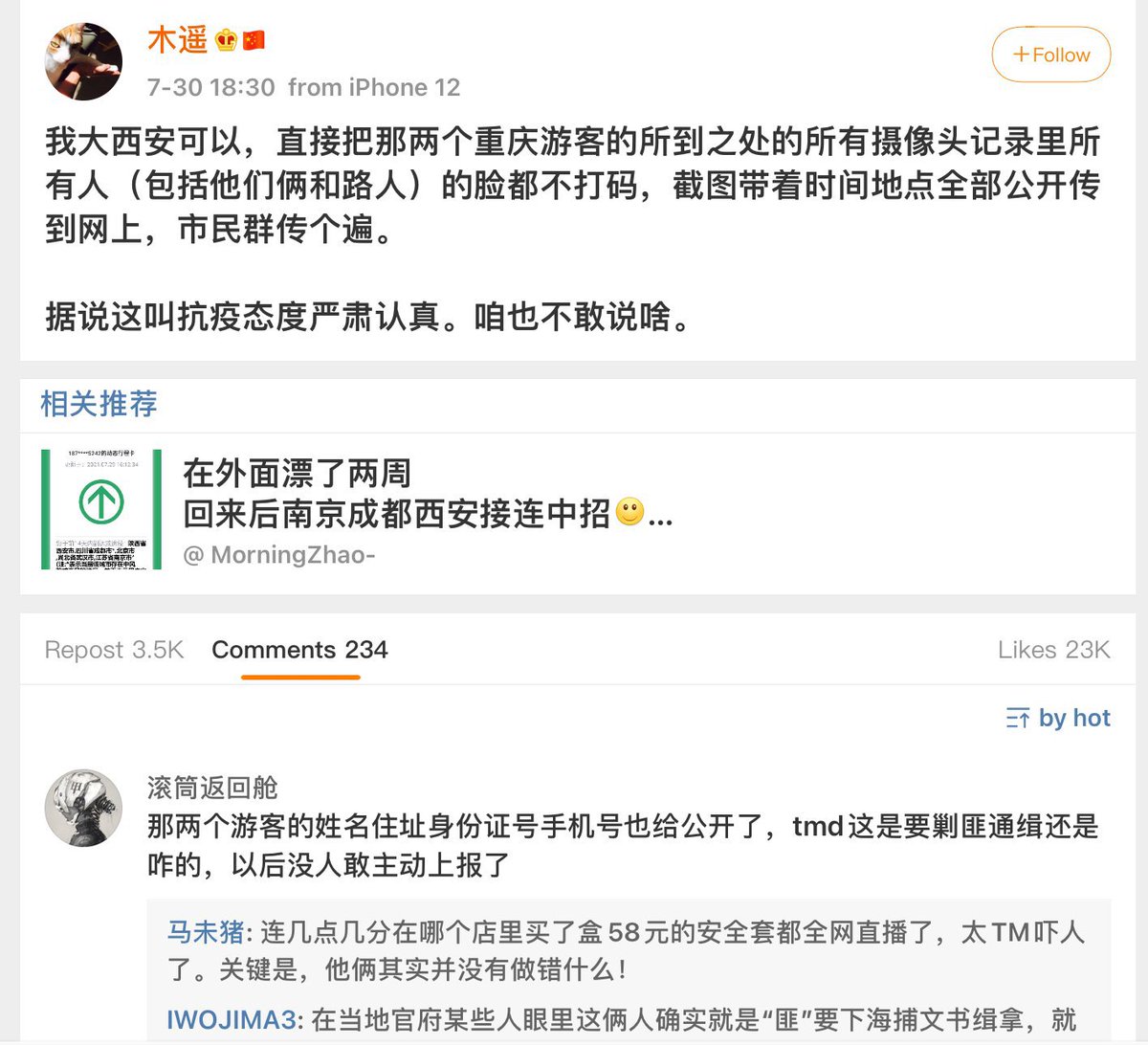 中国政府以保护隐私为由,拒绝向世界卫生组织提供早期病人病历。但是现在西安政府,将重庆两个游客所有行踪,甚至购买避孕套的详细信息都公布在网上,还有身份证号和电话,现在不保护隐私了?