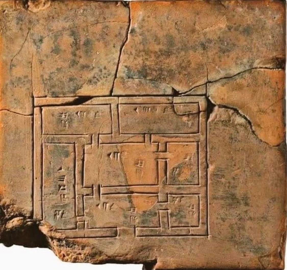5000 年前苏美尔人制订的带有中央庭院的房屋规划图(Ur III 时期。 Vorderasiaatisches 博物馆,柏林 )。
