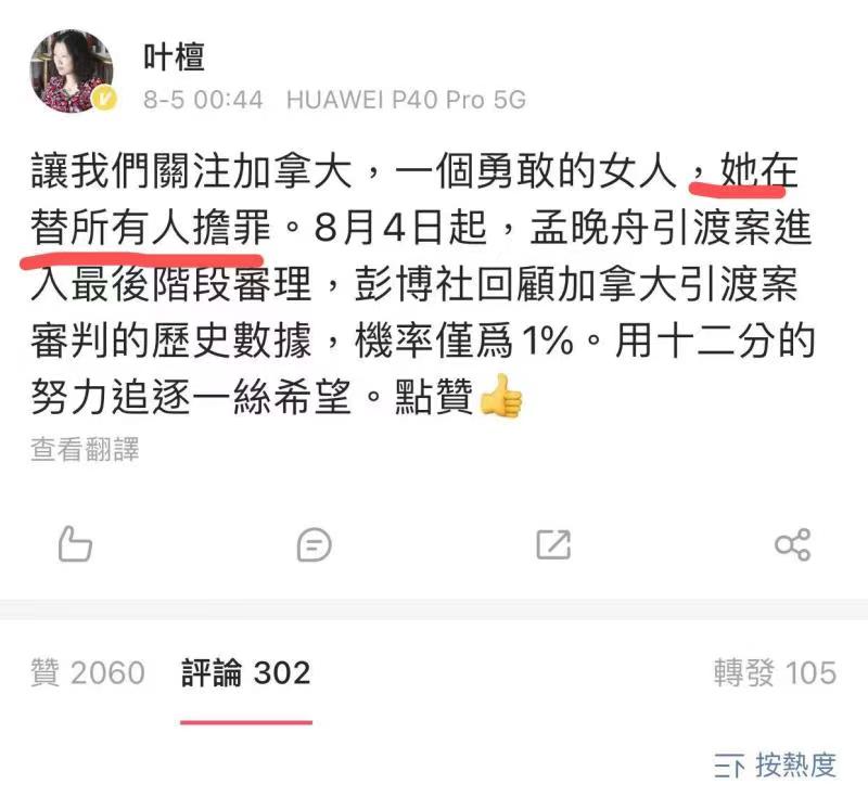 孟晚舟是加拿大国籍,她有罪你替加拿大人担罪就罢了,叶檀还要拉上全部中国人,叶檀你是总书记吗?