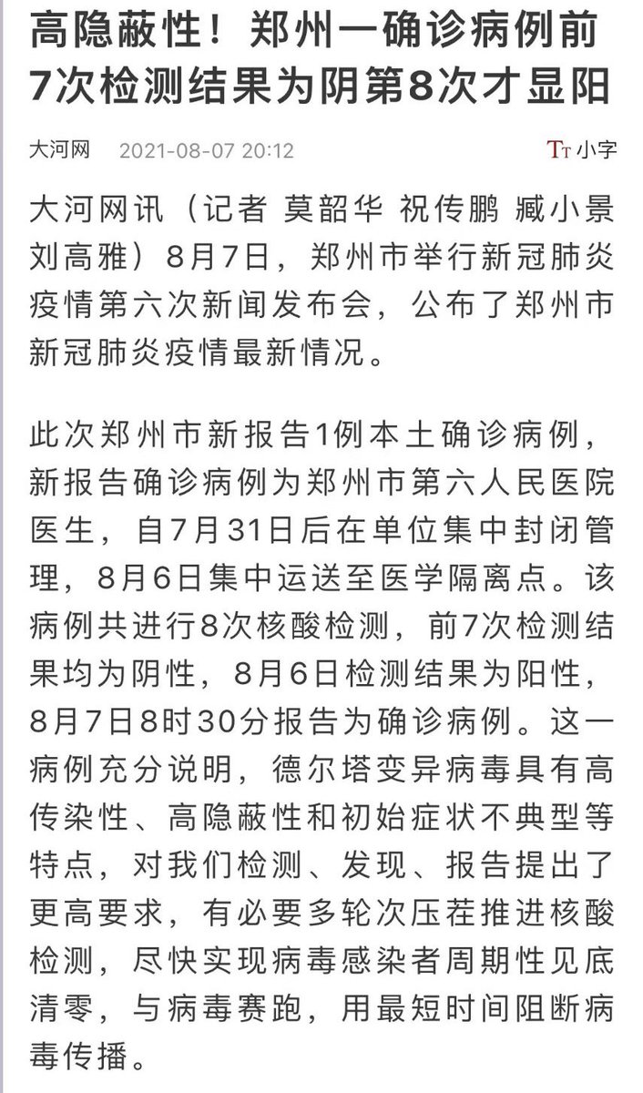 郑州有一个病例测了八次核酸才测出阳性,得出的结论竟是德尔塔变异太狡猾了,高隐蔽性!好吧,这下子全民测核酸得测八轮?
