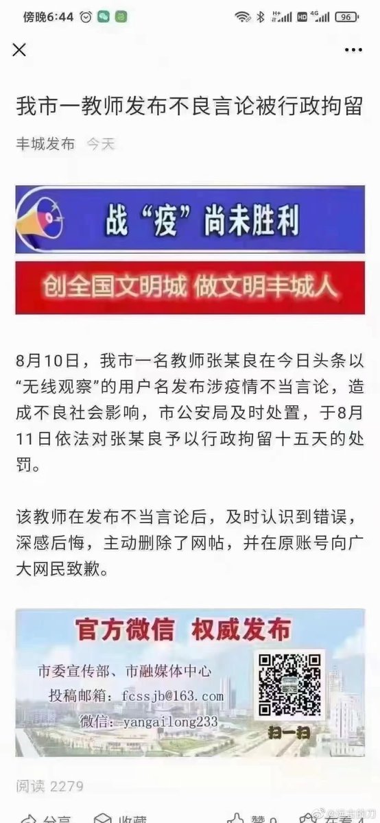 8月10日,江西省宜春市丰城,一老师在今日头条留言提了条建议,被行政拘留14天!#中国 #共产党 #China #CCP #COVID19 #中国疫情 #新冠病毒 #江西 #宜春 #丰城
