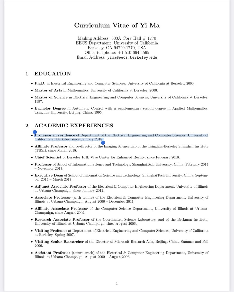 马毅其实不是伯克利计算机系的正式教授,是professor in residence,类似于兼职教授,不属于长聘教轨系列。