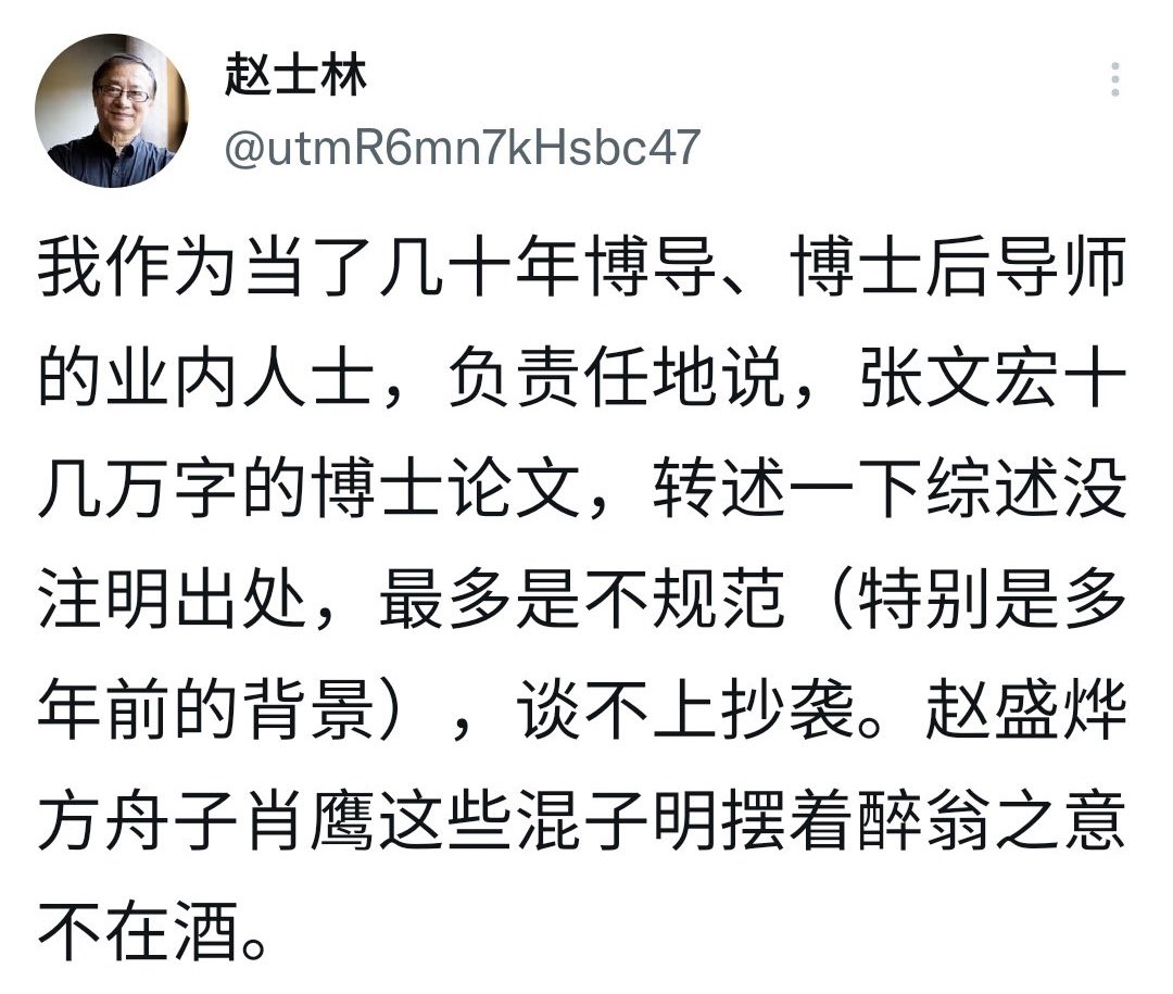 海外“反贼”与党国高度一致,力挺学术骗子张文宏,不是因为他们是大外宣,而是因为听轮子指挥,轮子已定性揭露张文宏抄袭是党国在迫害张文宏。骂街派“国学家”“美学家”赵士林已退休到美国养老,没资格上我的学术造假帮凶榜。