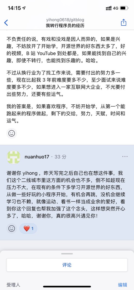 诚惶诚恐的一个回复,因为我写的东西,世界上某处某个人看到而在某个时刻有些不一样的想法,很奇妙的感觉,也是为什么喜欢开源。