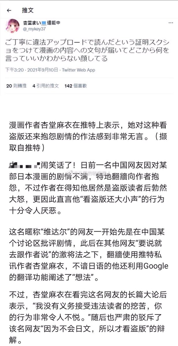 这个贴梳理了前两天看盗版日漫的简中人翻到推上跟原作者抱怨剧情,没想到后续竟然还有人脸大到说双方都有责任。