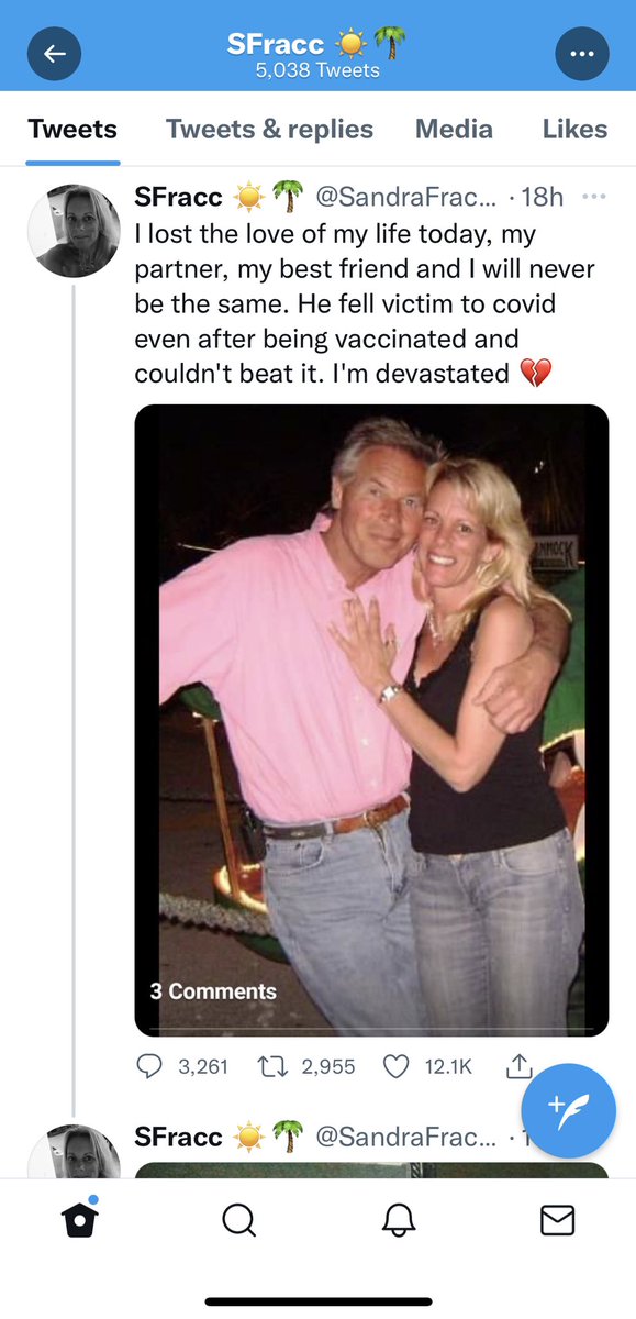 一位女士在推特悼念她的亡夫,死于疫苗。现在强制疫苗接种的逻辑就是:疫苗很好,你必须接受,死了跟疫苗无关,因为你有其他的病,脚气、沙眼、脱发、阳痿、早泄、不孕不育都算!