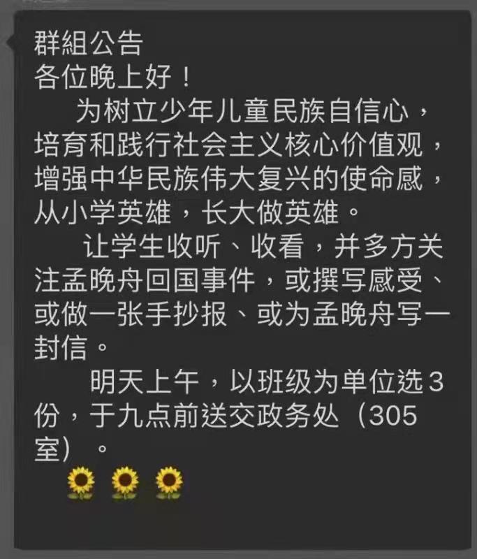 昨天看到中国某校发的作业题影印件:“孟晚舟是谁?”“她被谁扣押?”“她是怎么获救的?”“孟晚舟事件告诉我们什么?”……今天又读到下面的通知——