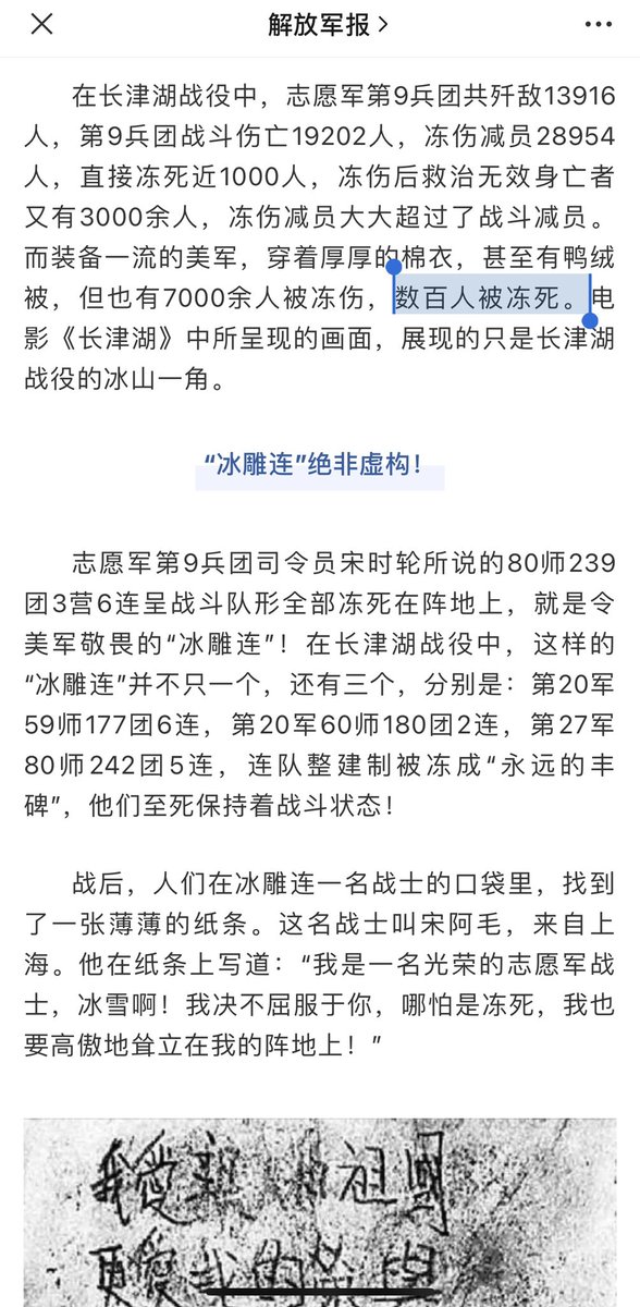 长津湖战役美军是有冻死的,但不像《解放军报》说的美军数百人冻死那么夸张,只冻死几人。是在11月28日晚遭遇西伯利亚冷锋,气温骤降到零下三十几度,长津湖东岸步兵31团战斗队有几名士兵冻死在散兵坑。志愿军官方承认的冻死4千多人。