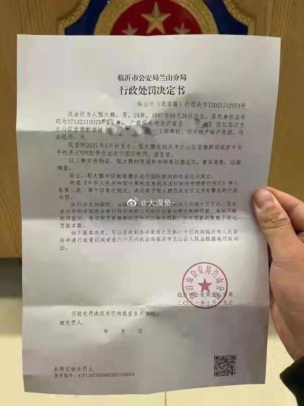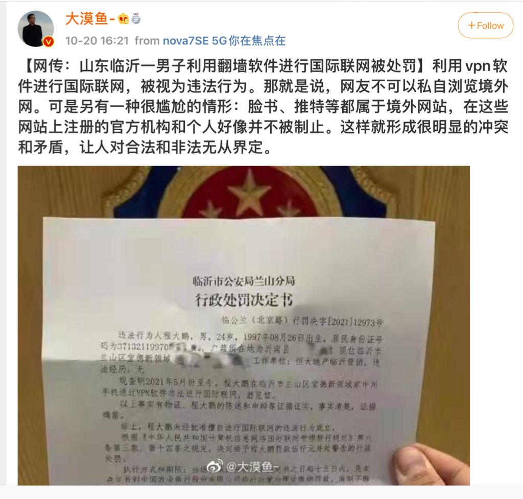 翻墙被处罚,外网也发一下,免得粉蛆总是说,虽然有墙那是保护我们的,我们要想翻还不是随便