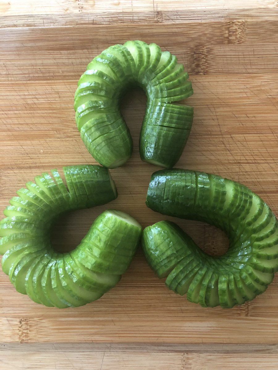 前几天买了太多的黄瓜,总吃拍黄瓜也没意思,今天想起来换个吃法,做个蓑衣黄瓜吧刀工把我自己都惊着了,居然没有一片儿断掉的,边做边玩儿还好吃,真是太开心了