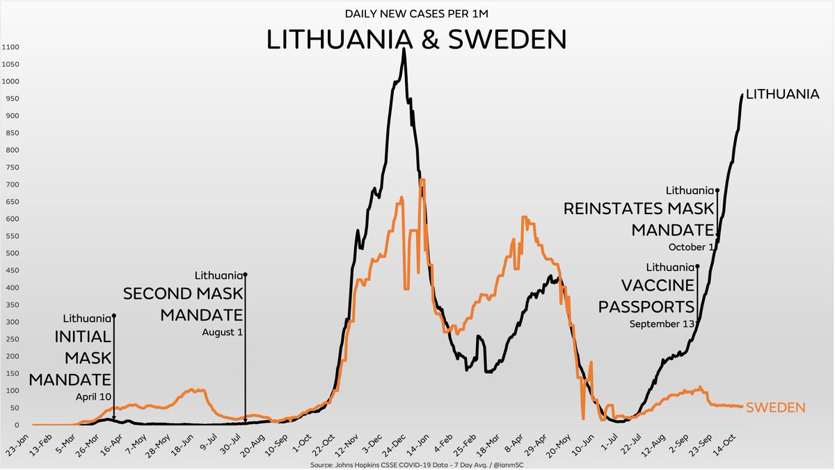 世界上最严格的疫苗护照制度实施六周后,立陶宛的人均COVID新病例飙升至历史新高。是瑞典的16倍以上,尽管瑞典取消了所有限制,但其人均新病例仍处于历史最低水平。