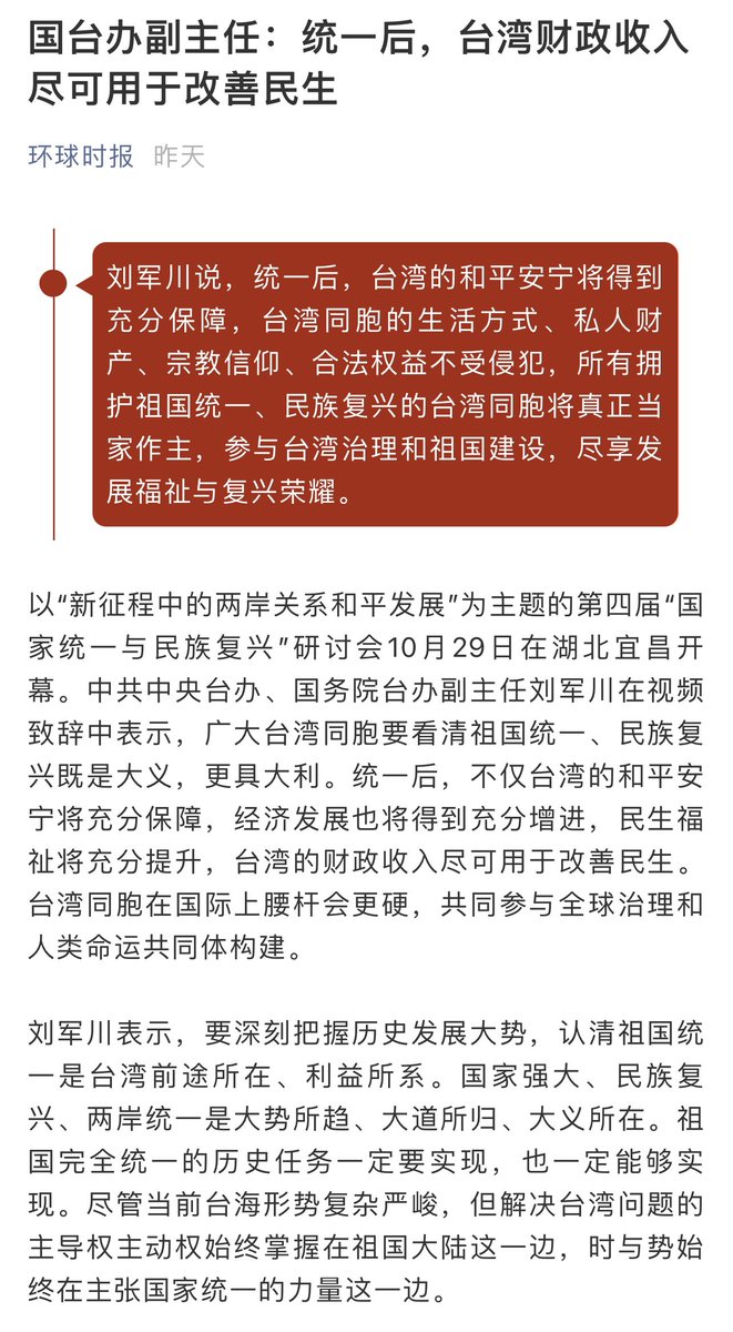 意思是统一之后生活在水深火热之中的台湾人民从此过上了和大陆人民一样的幸福生活。