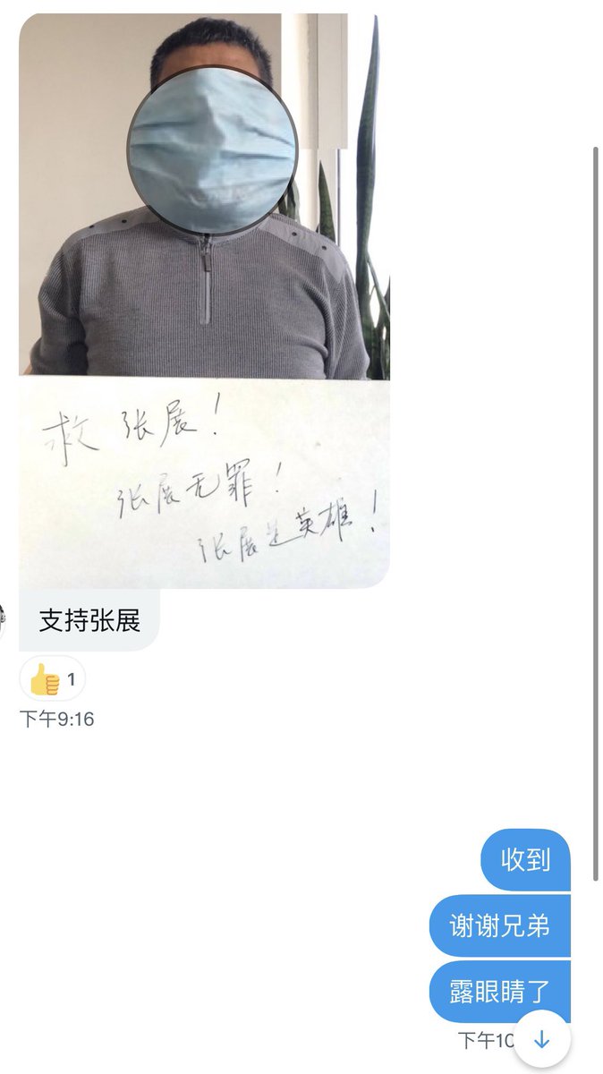 这是来自国内的一位支持张展又粗心大意的朋友,我只好放大了他的口罩,挡住了眼睛。感谢国内勇敢的朋友们!注意不要粗心大意!把脸挡好保护自己,待大风起兮时发挥更大的作用!