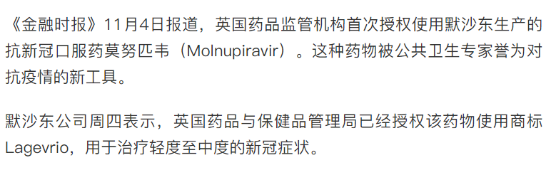 默沙东抗新冠口服药莫努匹韦(Molnupiravir)获英国批准,美股抗疫概念股大跌,Ocugen、莫德纳跌超14%!
