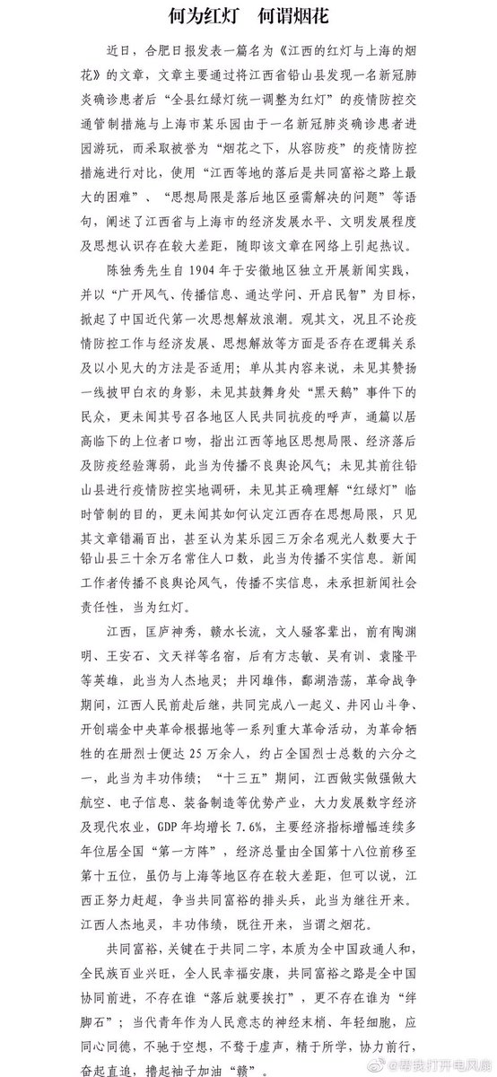 安徽日报把上海和把全县交通灯变红的江西某县对比,把江西人气得跳脚,各种要求安徽日报道歉。我是一直理解不了这种护校护家乡护祖国的情感(这里的护当然指的是不许说任何负面信息和批评)。