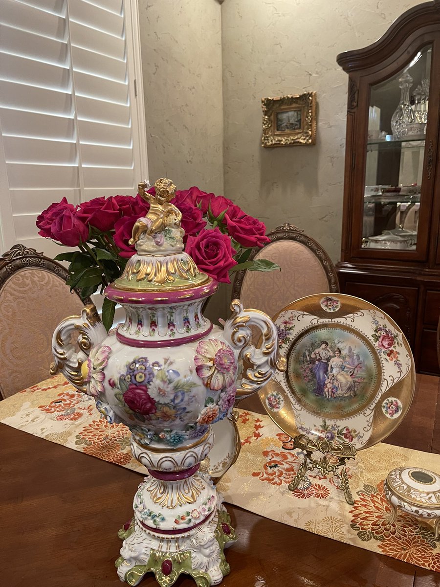 今天来回两个多小时去抱回来的宝贝,德国德累斯顿的大花樽,手绘加立体花朵还有描金,很重的大器物,还没时间去查它的历史,缺失了一个花瓣,其他都保存完好