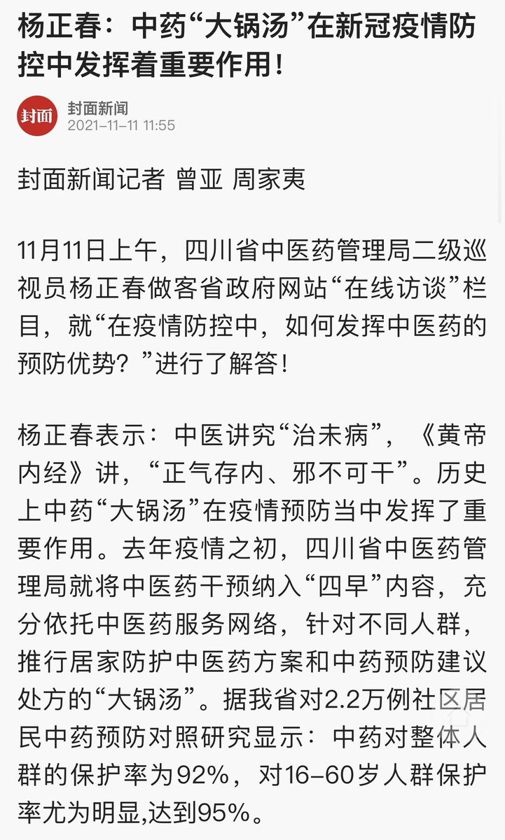 四川中医药管理局声称中药大锅汤对整体人群保护率达到92%,不比辉瑞疫苗差。还说是对2.2万名社区居民做对照研究得出来的。原来四川的新冠疫情这么严重,能在那里做药物预防感染的对照试验。