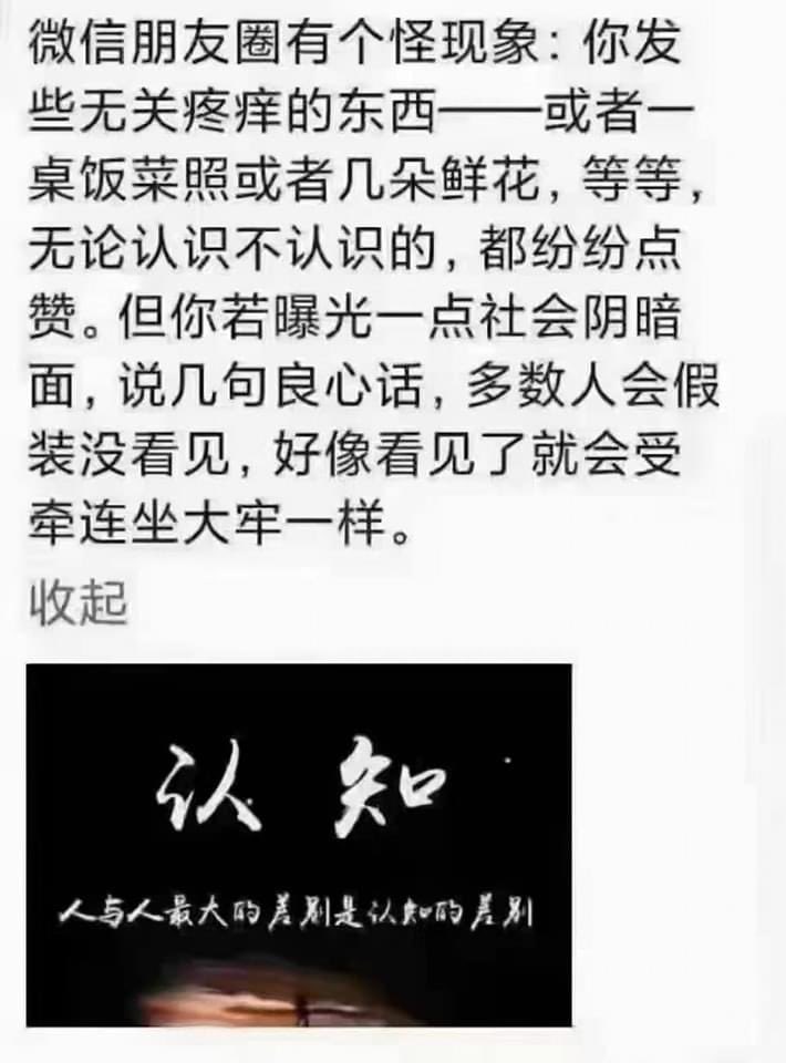 我很久不上微信了,但偶尔发旅游照就有很多点赞的,若发无论中美的敏感内容,没有点赞的,我说的这些人基本是我认识的华人,他们整天在微信圈里刷存在感,从不上推特,他们基本都是受过高等教育也有很好职业的华人。