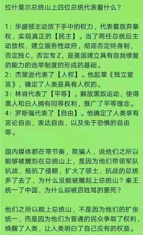 美国总统山的四个总统代表四个含义:民主、人权、平等、自由下面一段话给您提个醒儿,别被带歪了