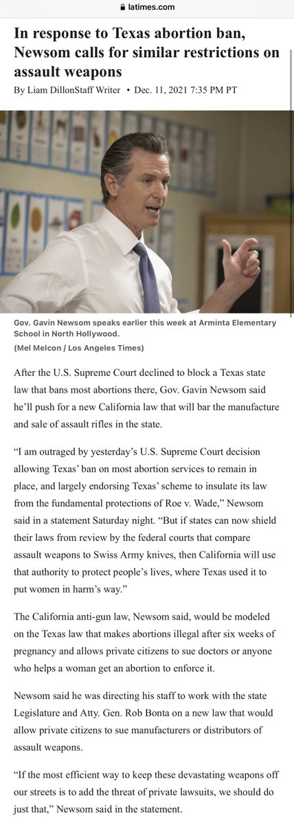 我是预言帝:加州州长说,既然最高法院不叫停得州通过授权民事诉讼来禁止人工流产,那么加州将学习这种立法方式,通过法律授权公民起诉军火商来禁枪。我一个月前就这么建议过了。