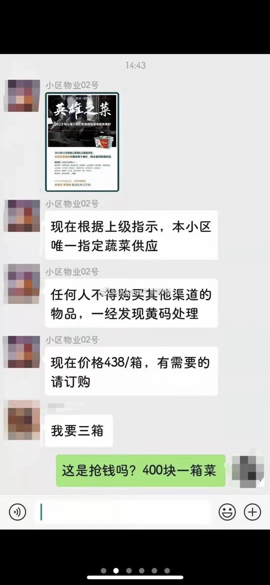 西安封城,政府指定的供应商卖的一箱菜卖到了438元,有人嫌贵,物业怒喝:吃不起就别BB,饿死你们这些穷人。