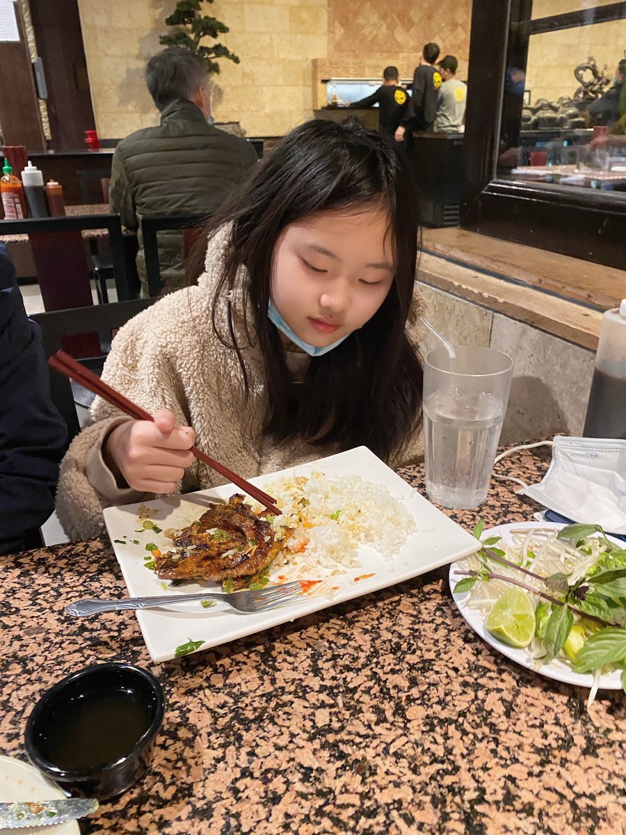 小美女终于回家了,一家三口半夜来越南餐馆吃饭