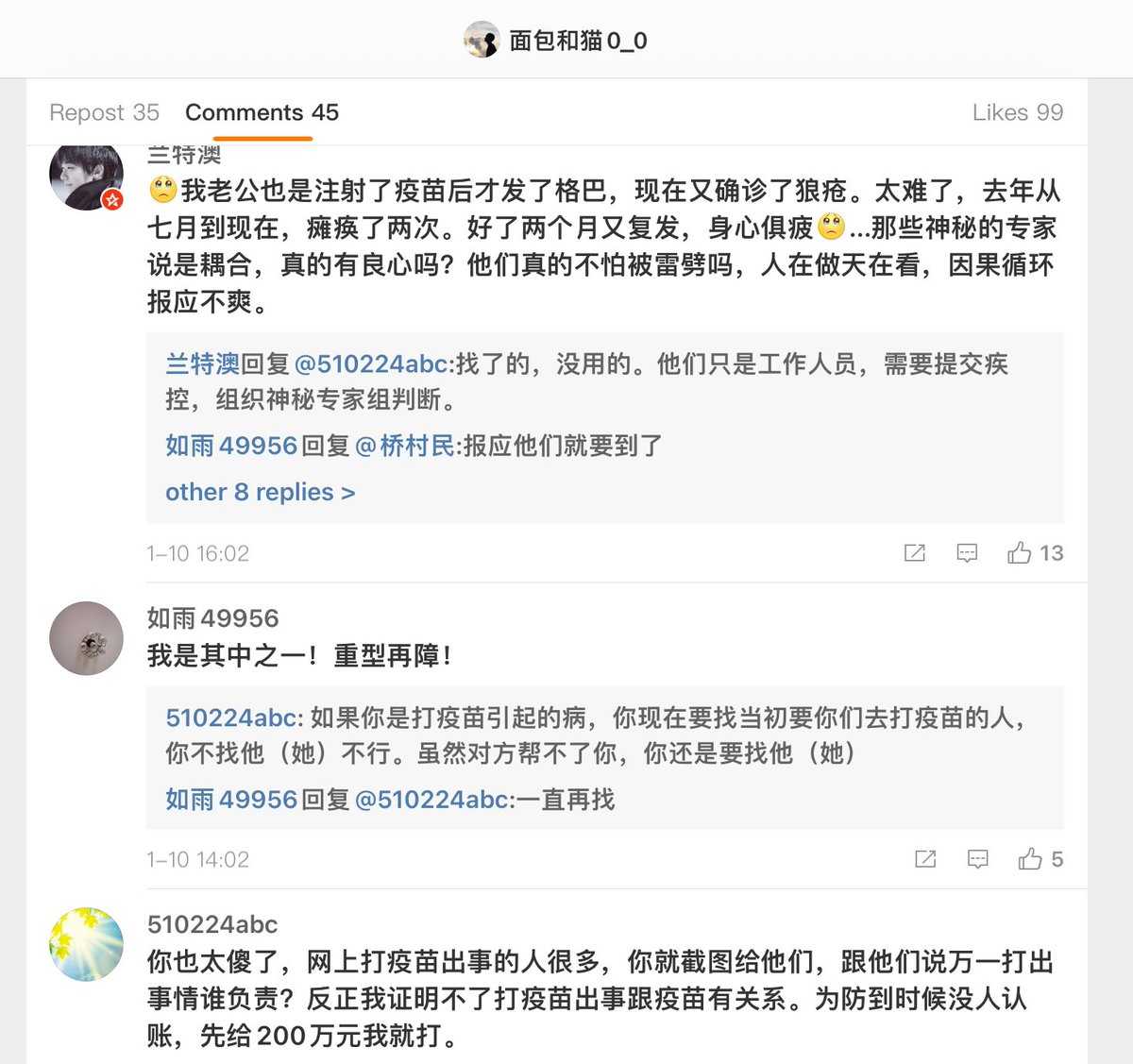 这位博主的妻子去年7月23日打疫苗,26日入院进了ICU至今,原本身体健康,没有发现致病病毒,那除了疫苗引起想不出还有别的原因了。评论里有类似情况。