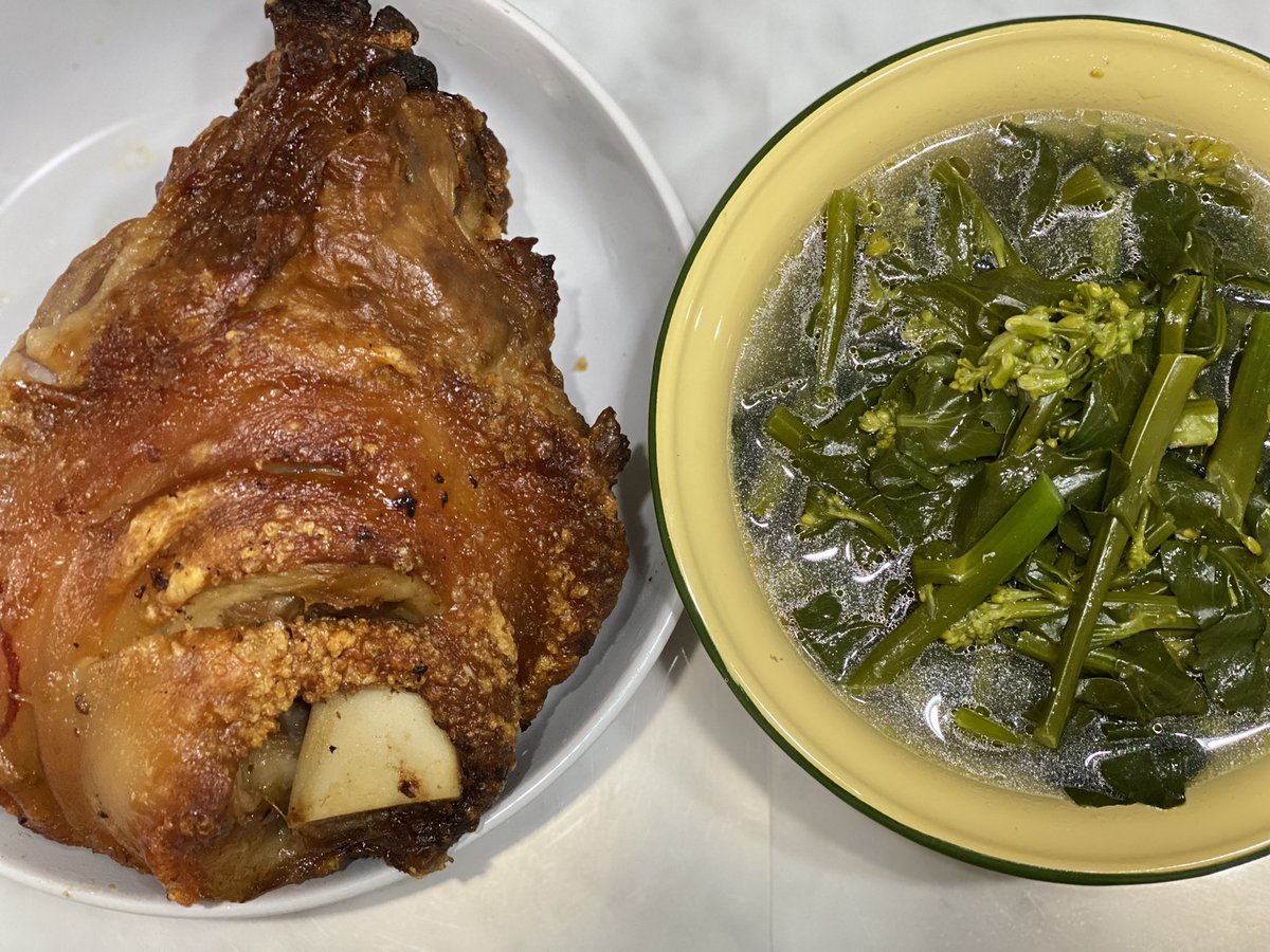 欢庆拜五晚餐:猪肘子配菜心汤。欧耶!