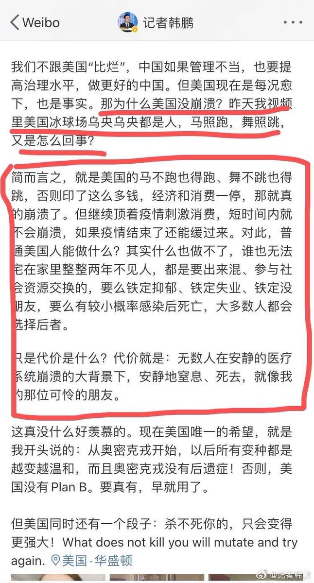 昨天说到那个CG TV的驻美记者,这个记者说啥了呢?随便看看以下。他有个视频,就是在美国的冰球场搞大外宣,在现场以春节名义放驻美大使广告,把一堆老虎公仔扔给现场公众,报道完然后在微博上继续说美国要完。蛆浓度爆表了,属于是