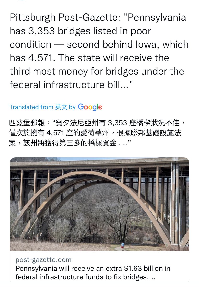 美国政府通过两党基础设施法资助, 刚宣布投资400亿美元修复全国上万座桥梁。目测这个预算分到每条桥上真的是毛毛雨啊,最后会不会需要中国基建帮忙呢?拭目以待!