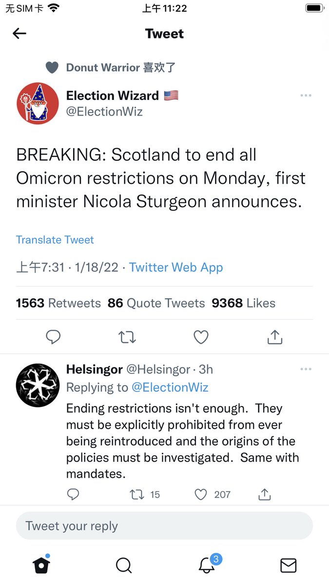 突发:苏格兰首席部长 Nicola Sturgeon 宣布,周一将结束对 中共病毒Omicron 的所有限制。