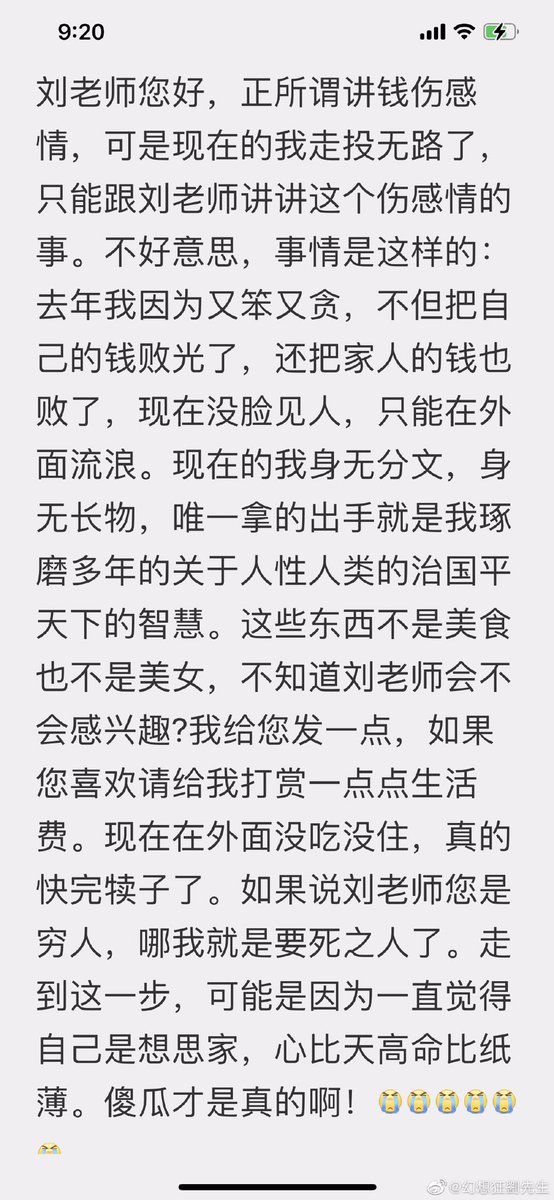 ”我身无分文,唯一拿的出手的是治国平天下的智慧”想不到现在的网络乞丐都这样大言不惭了,智慧在图二可能是到处发给大V撒网的,这个投给幻想狂刘先生的被晒出来了。