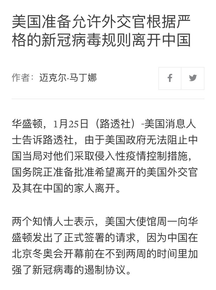 路透社:由于美国政府无法阻止中国当局对他们采取侵入性疫情控制措施,国务院正准备批准希望离开的美国外交官及其在中国的家人离开。