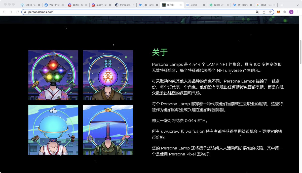 ,我mint了这个@persona_lamps灯头人。日本艺术家,虽然没什么名气,但是感觉他们是来组团炒nft的,画家好像和胶囊和uwu有关系,注意风险。官网不能印,只能通过合约。
