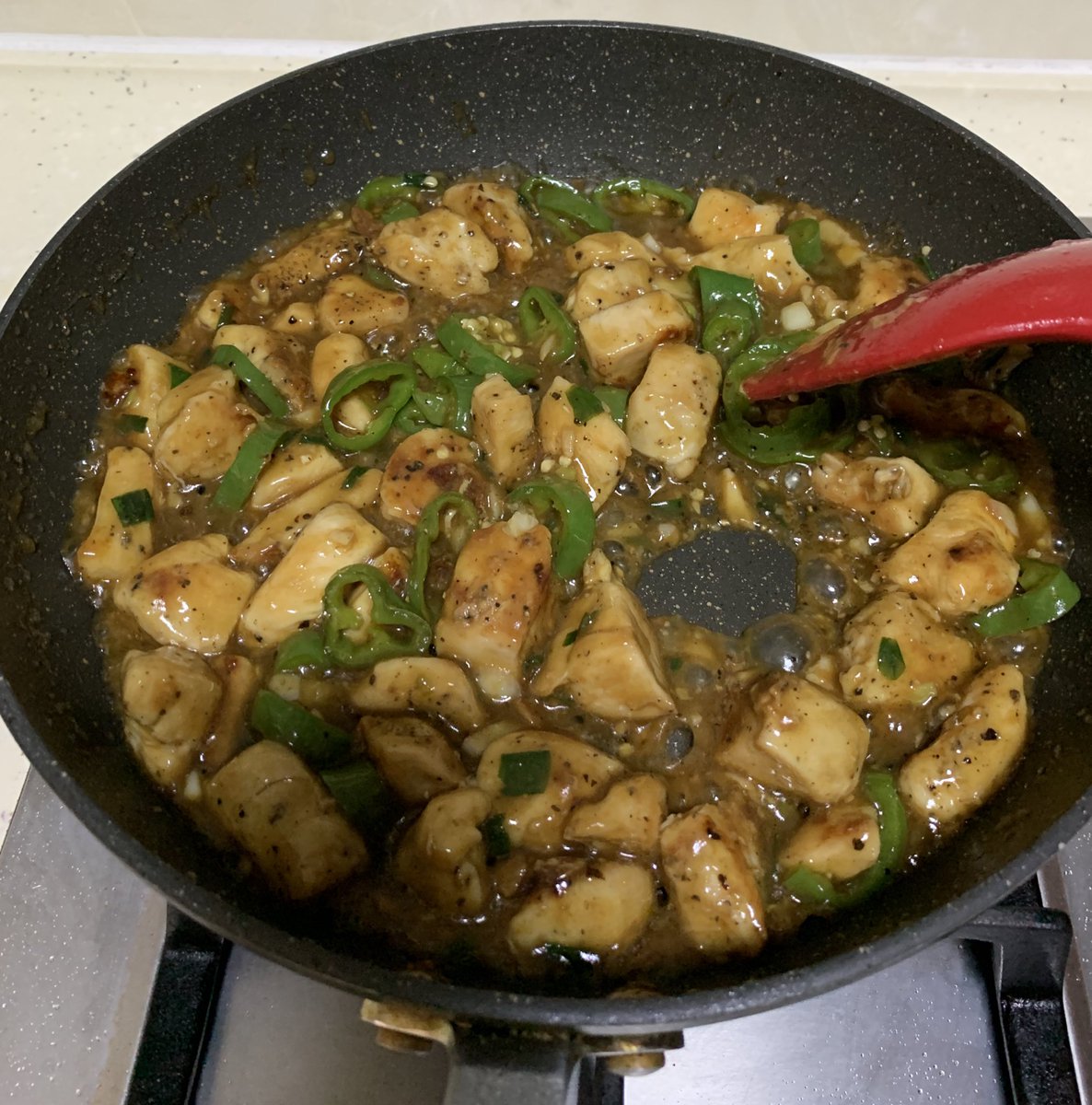 #八爪厨房 今日菜名:蒜姜鸡全家(因为最后放蛋搅拌)先拿蒜姜胡椒盐玉米粉腌制鸡肉15分钟。然后下锅煎至熟捞起。下黄油炒蒜青椒和葱炒一会加酱油。玉米粉和水搅拌均匀,下到酱里。最后丢鸡肉下去加柠檬汁。把温泉蛋打在饭里。好吃哭了