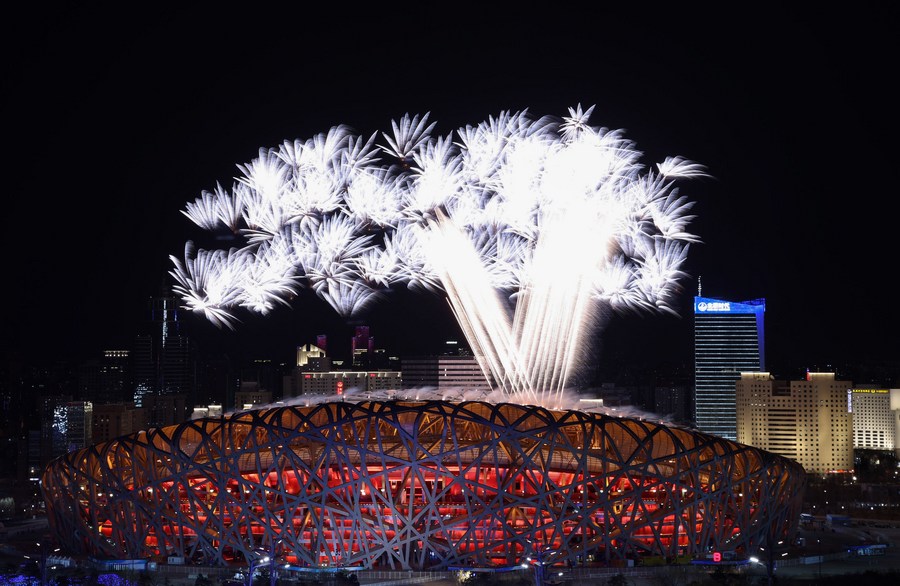 2月4日晚,第二十四届冬季奥林匹克运动会开幕式在北京国家体育场举行。图为开幕式上的焰火表演。